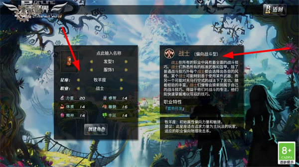 1、選擇戰士職業,設置名稱、發型、服飾等,點擊創建角色,開啟異世界OL的戰士冒險之旅,利用戰士全面的戰斗技巧。