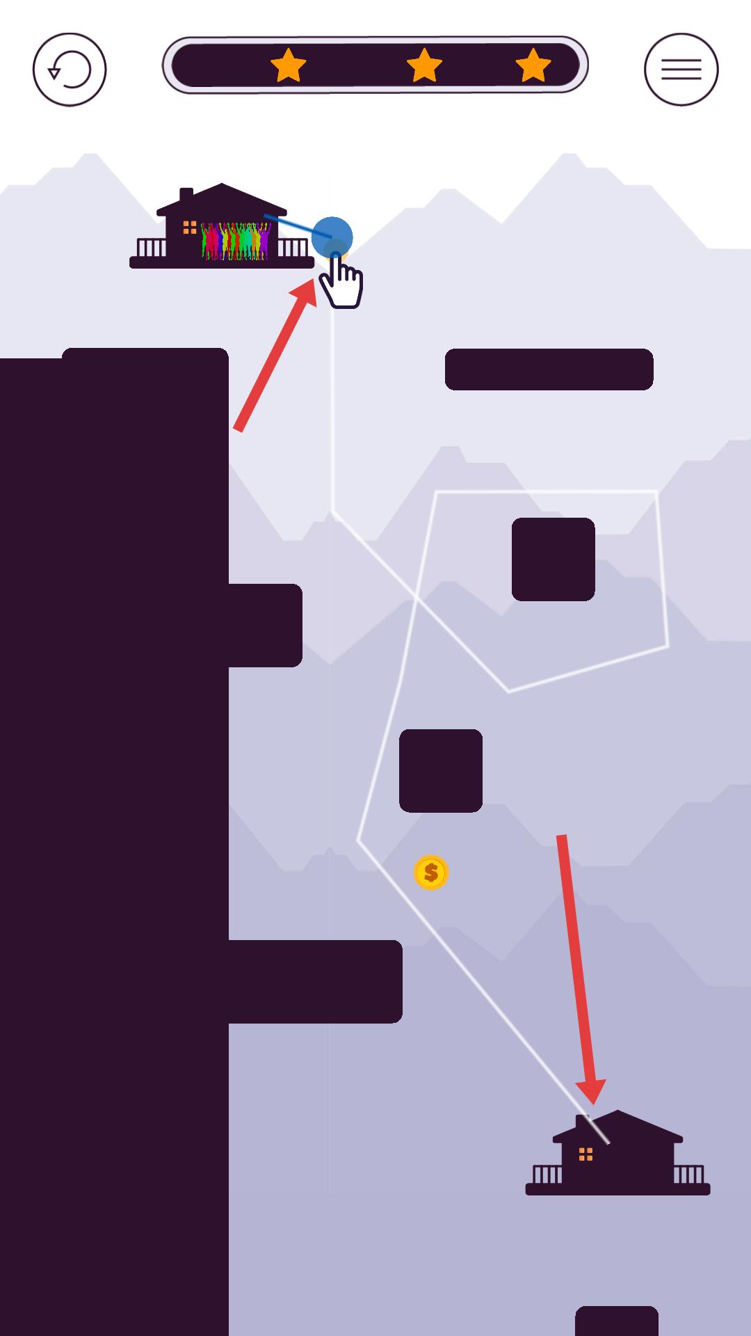 2、進入游戲需引導藍色球體從上方房屋,沿著路徑避開障礙物,到達下方房屋,要規劃好球體移動軌跡。