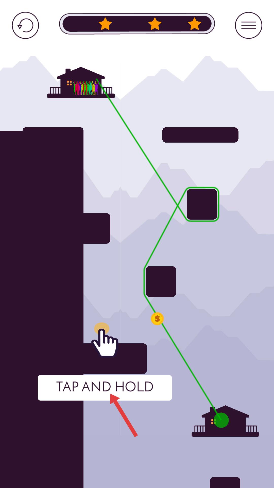3、游戲過程按照提示長按,點擊并按住屏幕,讓球體沿著綠色路徑移動,同時收集金幣確保順利到達目標房屋。