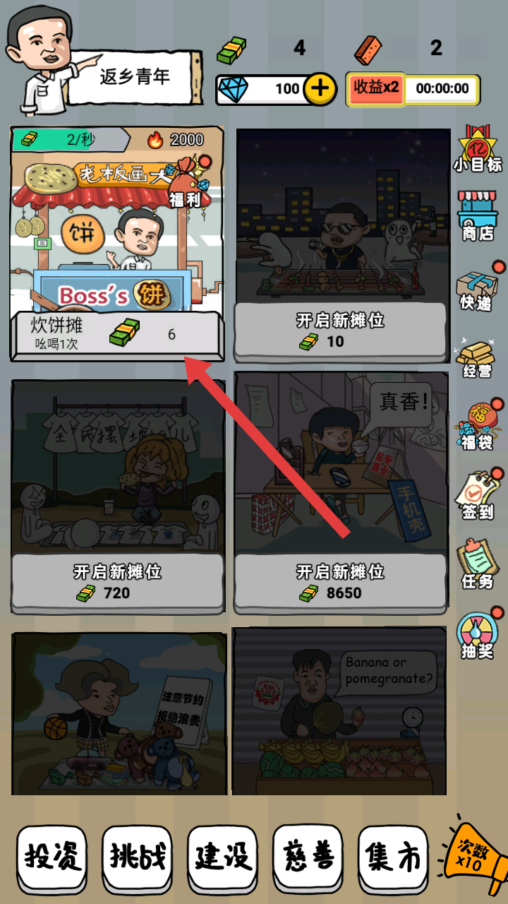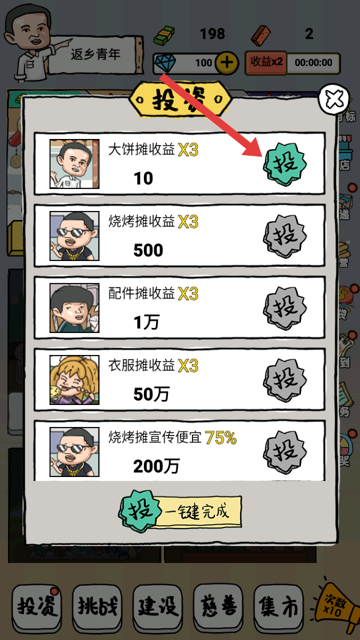 2、投資界面有大餅攤、燒烤攤等不同攤位的投資選項,花費對應資金投資,可提升攤位收益,助力攤位發展。