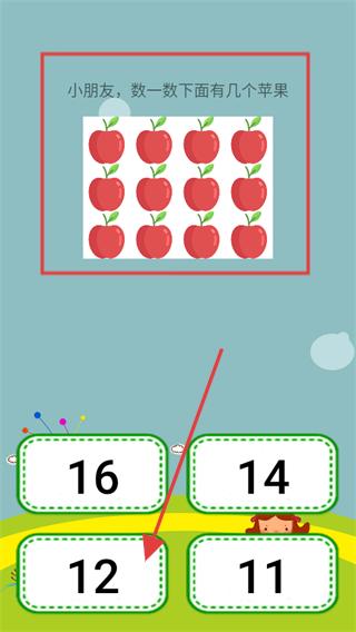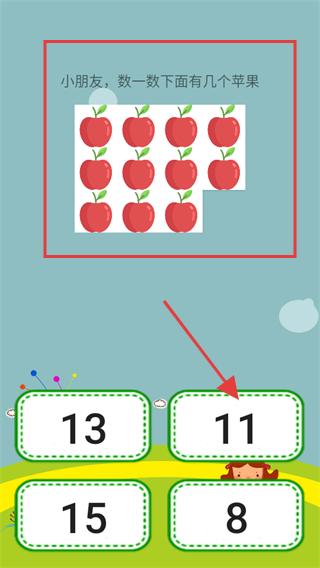 2、在數蘋果的題目場景中仔細觀察畫面里的蘋果數量,然后看下方的數字選項,選擇與數出蘋果數量對應的數字11。