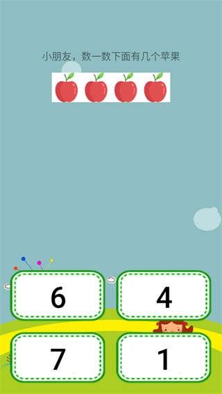 1、進入游戲看到有數一數,比一比等功能按鈕的界面,點數一數按鈕,進入數蘋果的題目場景,準備開始數數練習。