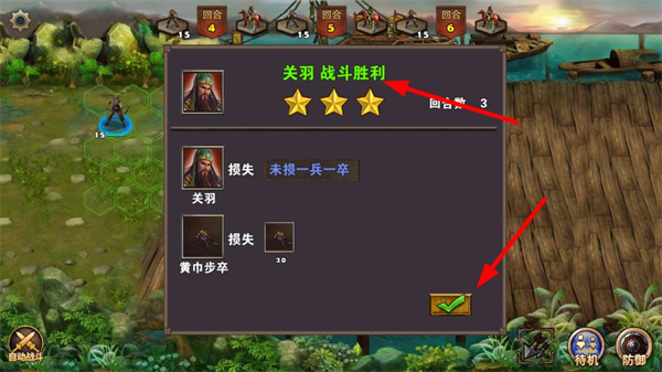 4、戰斗勝利后可獲得三星評價,點擊確認結算,獲取經驗和資源,提升武將等級和戰力,繼續挑戰新關卡。