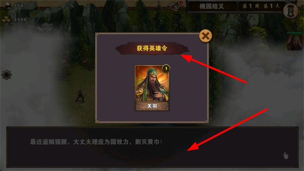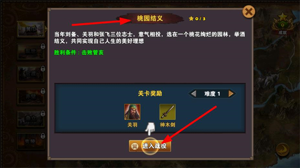 1、選擇桃園結義關卡,點擊進入戰役,開啟三國征戰之旅,擊敗管亥,獲取關羽和神木制等獎勵。