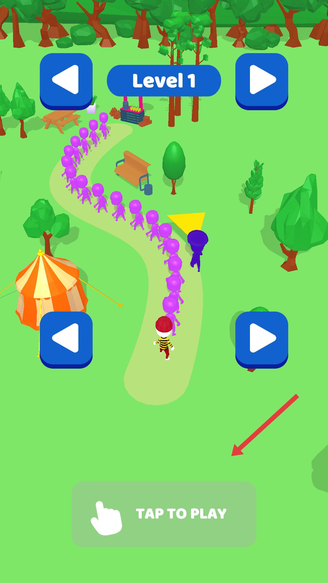 1、進入游戲,看到帶有TAP TO PLAY提示的界面,點擊后開啟第一關,進入有紫色小人排隊的場景。