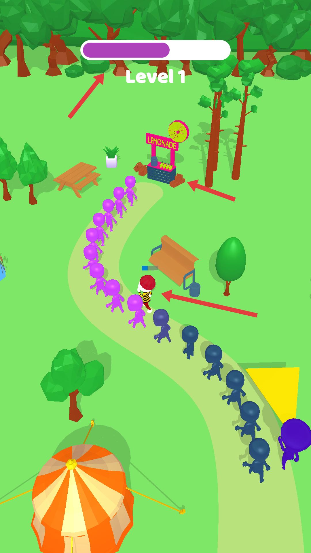 2、關卡中操控角色移動,引導紫色小人有序排隊前進,同時注意避開其他顏色的小人,保持隊伍整齊。
