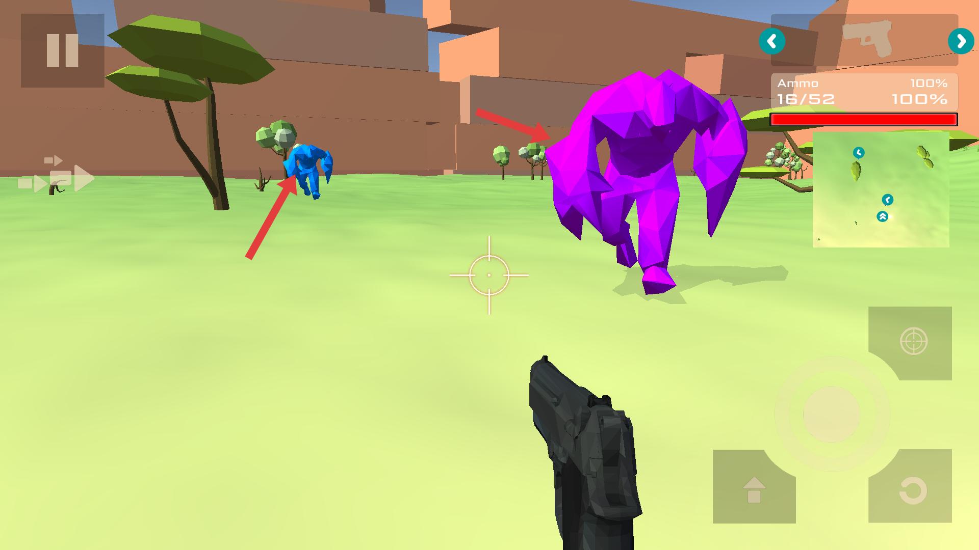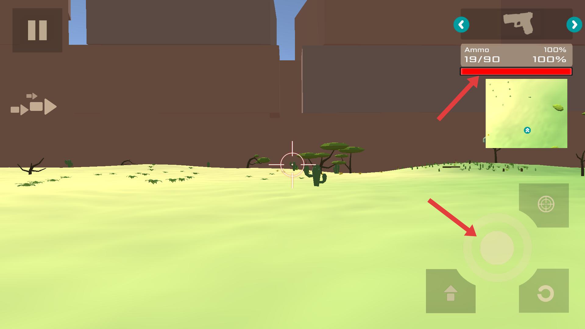 2、進入戰場后留意右上角彈藥和生命值情況,通過移動按鈕操控角色移動,探索場景尋找敵人。