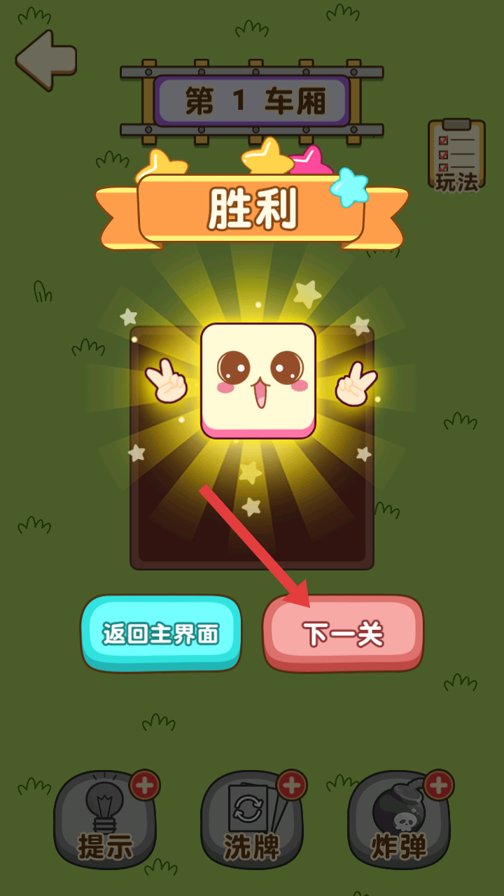 4、成功消除所有可消除的卡牌后,顯示勝利,點擊下一關,繼續挑戰火車車廂消消樂的下一個關卡。