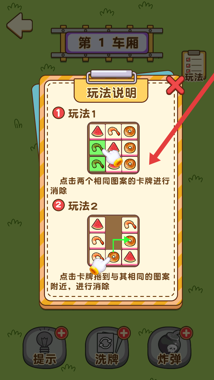 2、玩法有兩種,一是點擊兩個相同圖案的卡牌消除,二是點擊卡牌拖到相同圖案附近消除,了解后進入第1車廂的消除界面。
