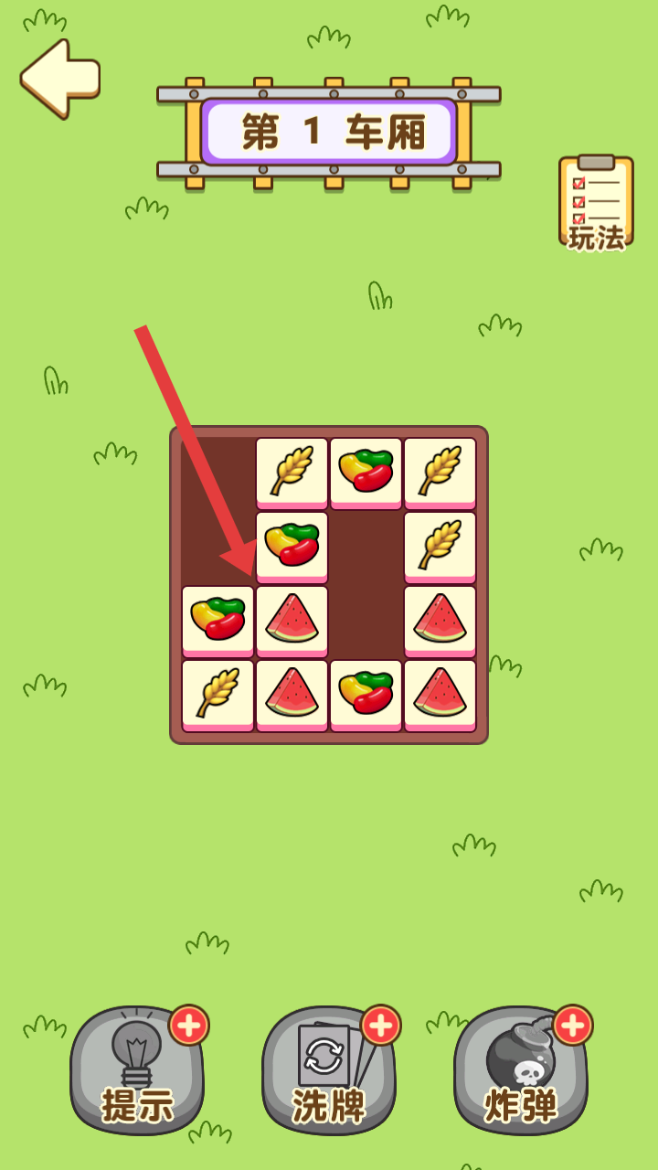 3、第1車廂的卡牌陣中尋找相同圖案的卡牌,比如小麥、彩色豆子、西瓜等,按照玩法進行消除操作。