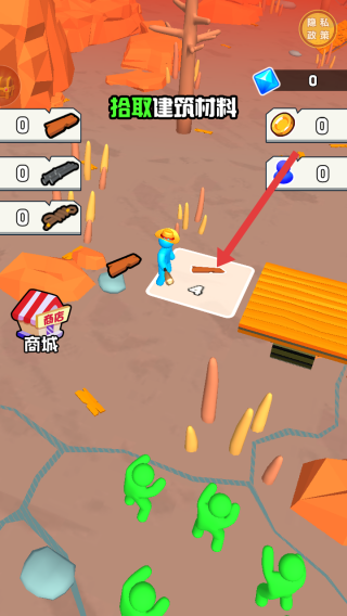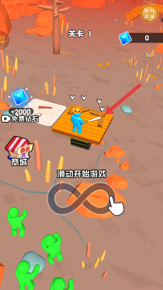 1、進入游戲關卡1,滑動屏幕開始游戲,操控藍色小人場景中行動找到木頭。