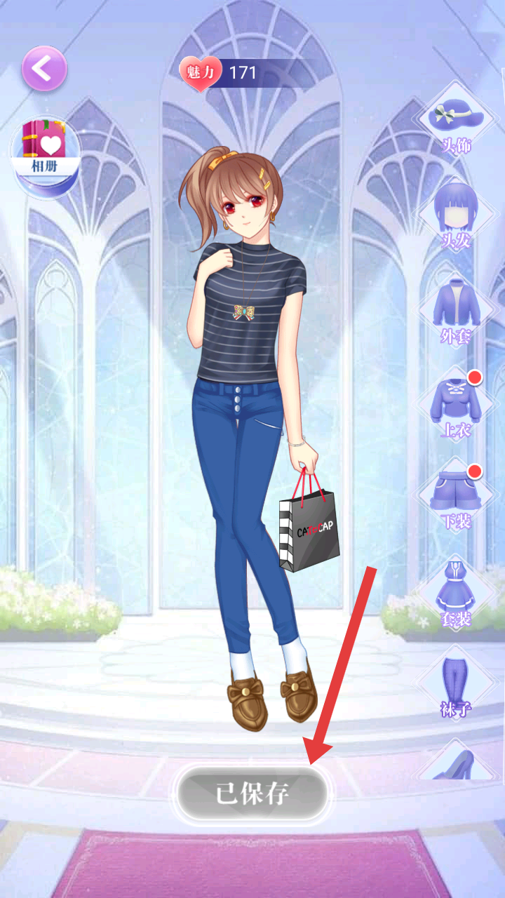 2、換裝界面,右側有頭飾、頭發、外套等多個分類,可選擇不同服飾搭配,搭配好后點擊保存,記錄裝扮。