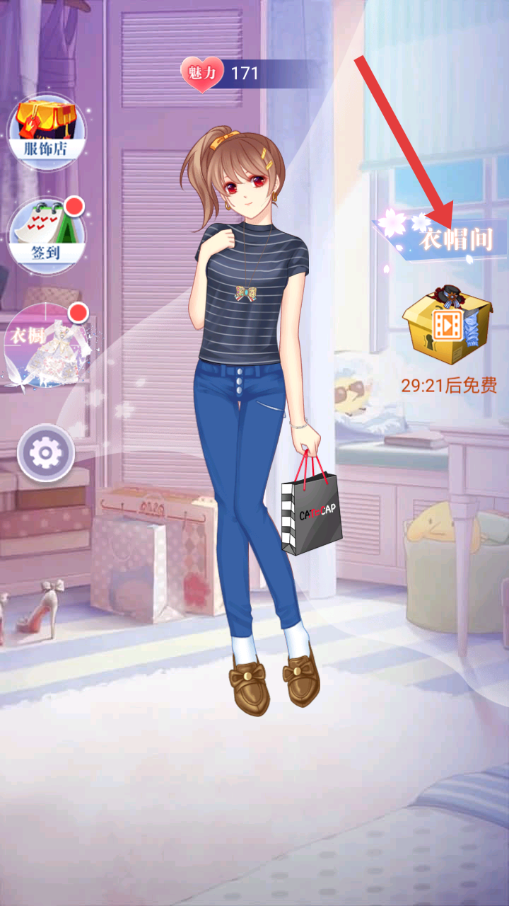 1、進入游戲,能看到角色初始裝扮,還有衣帽間等功能入口,可先了解界面布局,為后續換裝做準備。