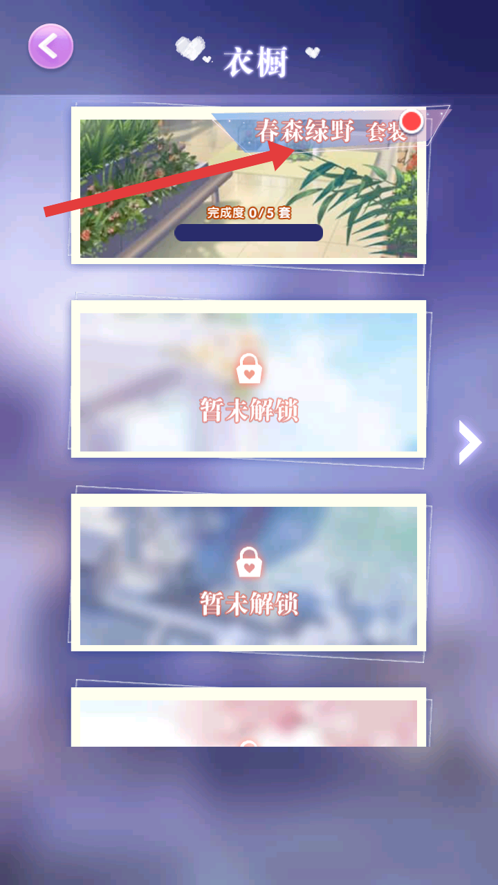 3、打開衣櫥,能看到春森綠野套裝等,可查看套裝完成度,朝著收集整套服飾的目標努力,打造完整穿搭。