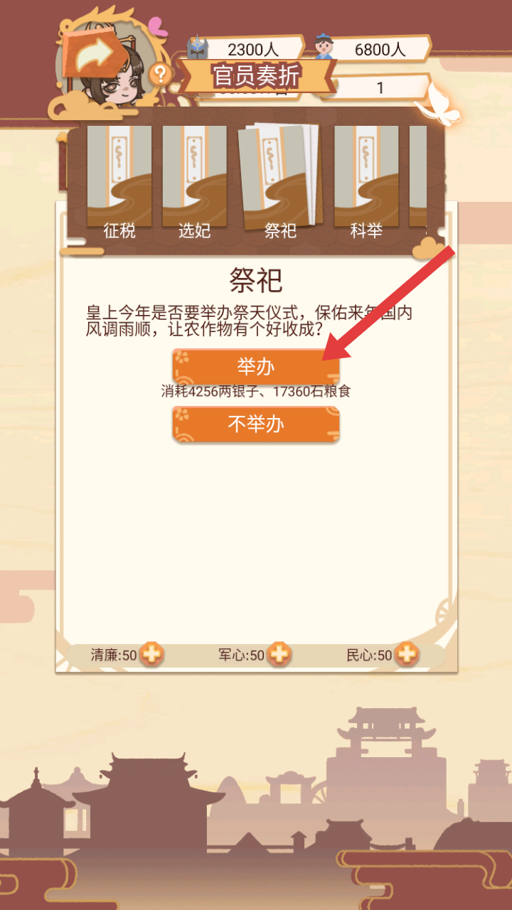 2、面對祭祀奏折,可選擇舉辦祭天儀式,消耗銀子和糧食,期望來年風調雨順,農作物有好收成。