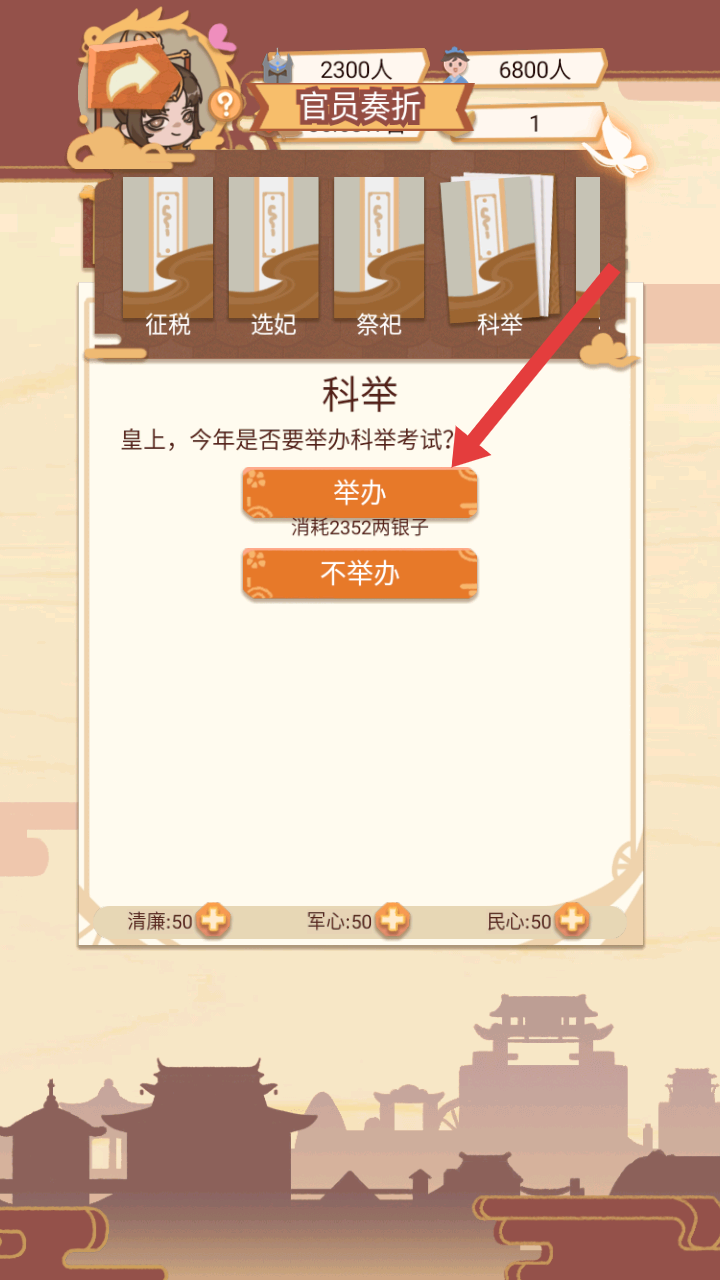 3、若有科舉奏折,能選擇舉辦科舉考試,消耗一定銀子,為國家選拔人才,助力治理。