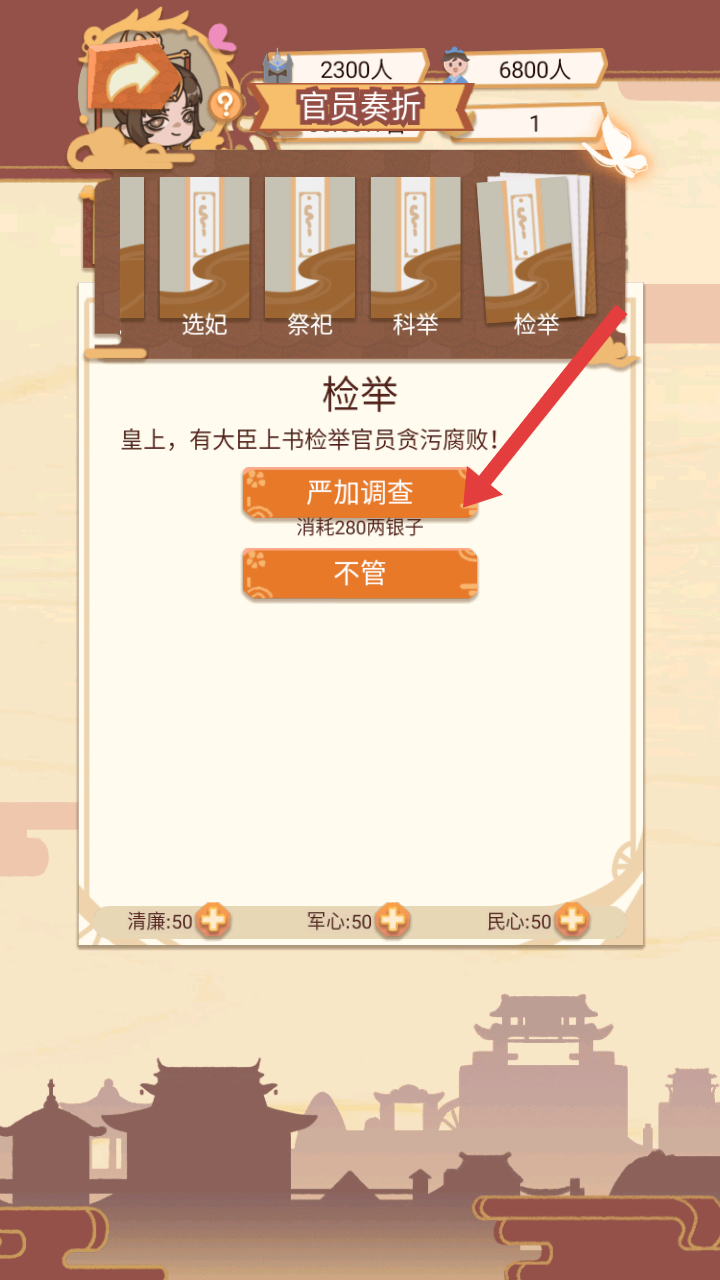 4、當有官員貪污腐敗的檢舉奏折,可選擇嚴加調查,消耗少量銀子,維護朝廷清廉,保障統治穩定。