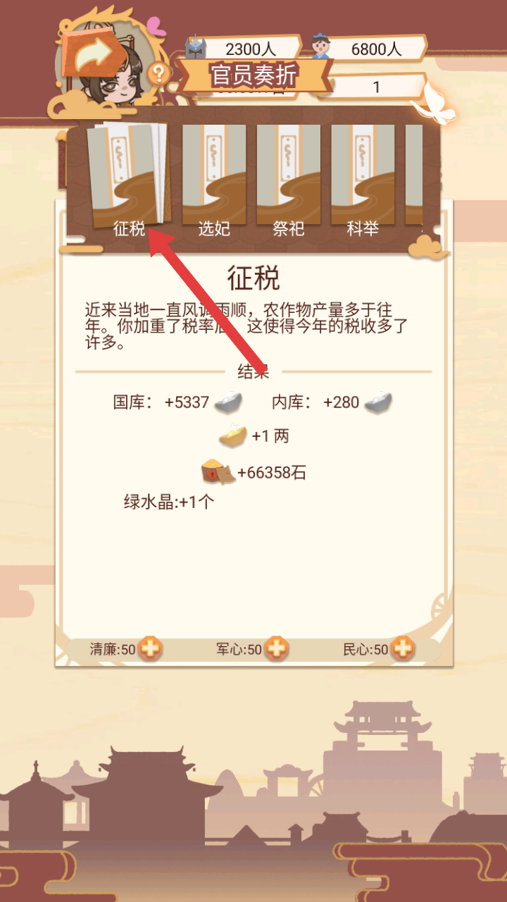 1、官員奏折界面,可選擇征稅,風調雨順時加重稅率,能增加國庫、內庫等收益,還可獲得綠水晶。