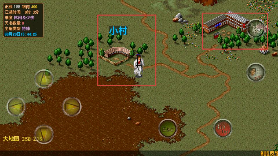 4、在大地圖中可前往小村等地點,探索不同區域,觸發各類事件,體驗江湖冒險,同時注意查看正邪值、銀兩等信息。