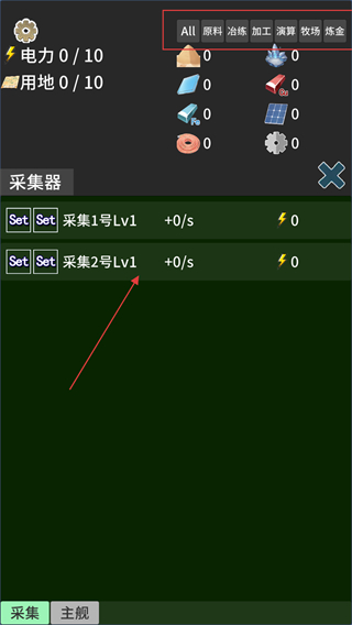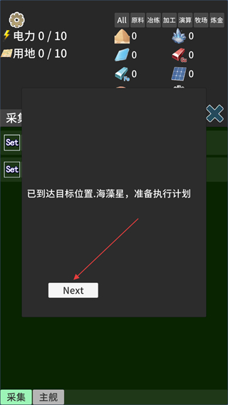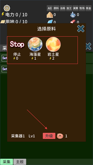 3、點擊采集選項進入采集器設置界面,點擊Set按鈕選擇要采集資源的星球,讓采集器開始工作獲取相應資源。