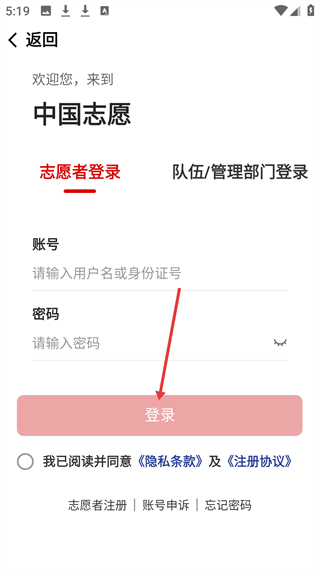 1、登錄界面,需輸入賬號密碼并同意協議,也可注冊、申訴或找回密碼,為志愿者提供賬號管理入口。