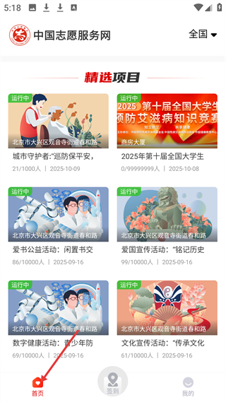 3、首頁展示精選志愿服務項目,涵蓋巡防、防艾競賽、公益宣傳等類型,項目標注運行狀態和參與人數,方便志愿者選擇。