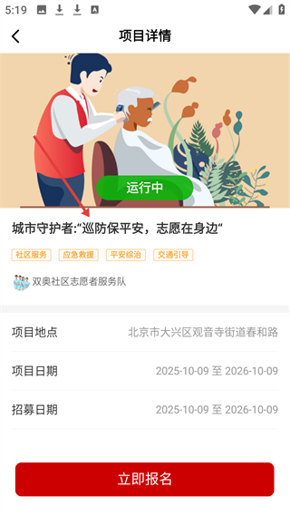 4、城市守護者項目由雙泉社區服務隊發起,地點在大興區,服務周期一年,涉及社區巡防等服務,志愿者可立即報名參與。