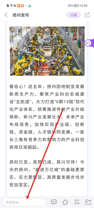 2、在資訊詳情頁面如產業向新行奮進萬億城的文章,可點擊談談想法,發表對文章的看法,完成APP的功能瀏覽、視頻觀看和資訊互動。