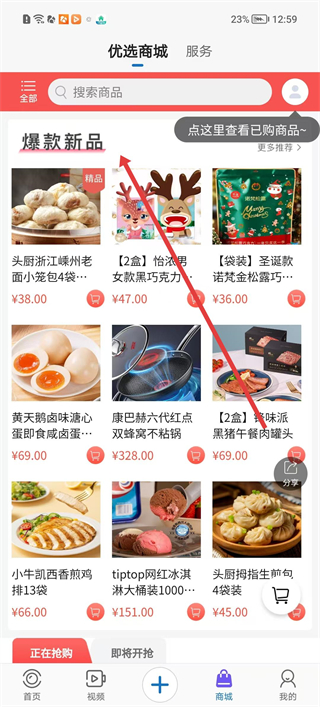3、點擊商城板塊進入優選商城頁面,瀏覽爆款新品,如頭廚浙江嵊州老面小籠包、怡濃黑巧克力等,查看商品價格和詳情。