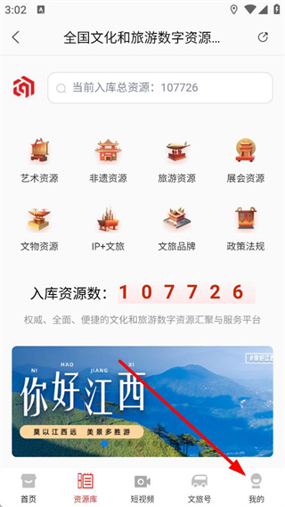 1、進入全國文化和旅游數字資源平臺的資源庫頁面,能看到藝術資源非遺資源等多類文旅資源分類,底部設我的選項,點擊該選項即可進入個人相關操作頁面。