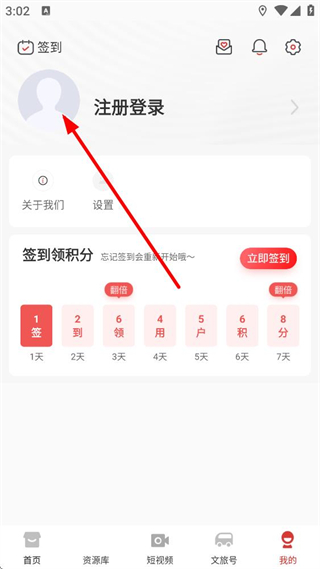 2、進入我的頁面,可看到注冊登錄入口,還有簽到領積分模塊,能參與每日簽到獲取積分,點擊注冊登錄按鈕,即可進入賬號的登錄相關界面。