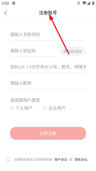 4、進入注冊賬號頁面,需輸入手機號碼并獲取驗證碼,設置符合格式要求的密碼,填寫昵稱后選擇用戶類型,勾選協議即可點擊立即注冊完成操作。