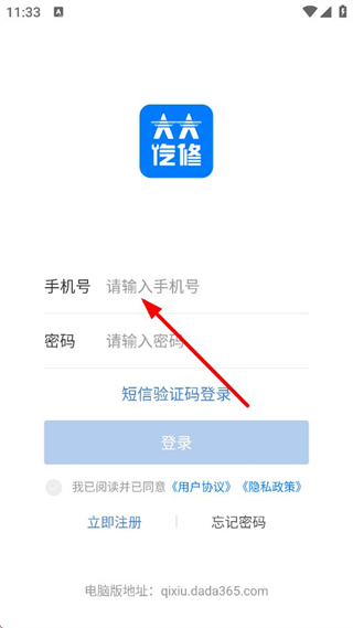 1、登錄界面可輸入手機號、密碼,勾選同意用戶協議和隱私政策后點擊登錄,也可選擇短信驗證碼登錄方式,登錄后可使用大大汽修的各項服務。