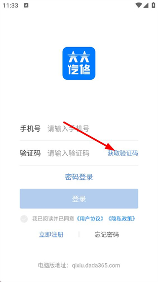 2、選擇短信驗證碼登錄時,輸入手機號、點擊獲取驗證碼,輸入驗證碼后點擊登錄,即可進入大大汽修平臺,享受汽修相關服務。