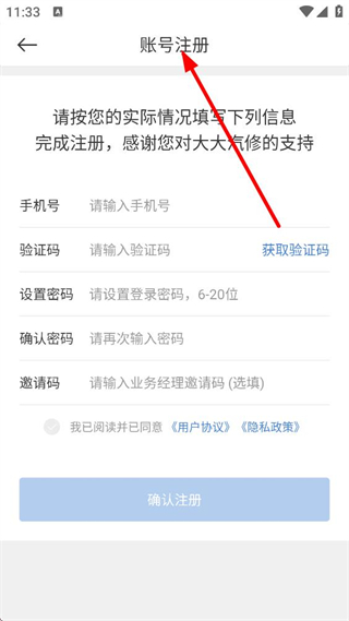 3、若為新用戶可點擊立即注冊,進入賬號注冊界面,輸入手機號、獲取并輸入驗證碼,設置密碼、確認密碼,填寫邀請碼,同意相關協議后點擊確認注冊。