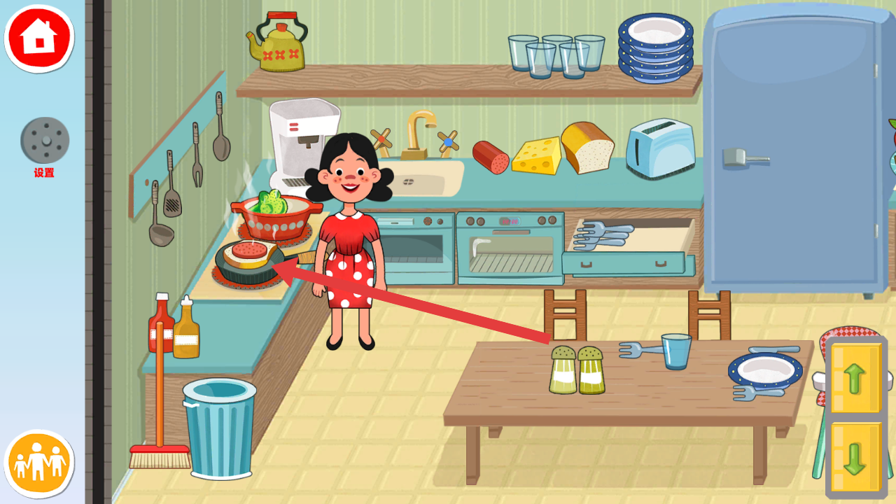 1、進入廚房場景,能看到灶臺、食材和廚具,可操作烹飪食物,還能整理餐具,讓廚房變得整潔有序。