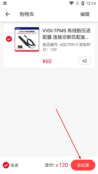 4、進入購物車頁面勾選需要結算的商品,查看合計金額,點擊去結算按鈕,即可推進該商品的下單支付流程。