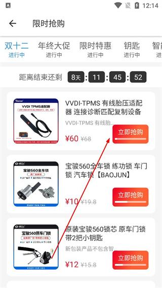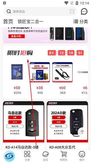 1、進入軟件首頁,找到限時搶購板塊,點擊進入該板塊頁面,瀏覽展示的各類鎖匠工具商品,查看商品的價格及優惠信息。