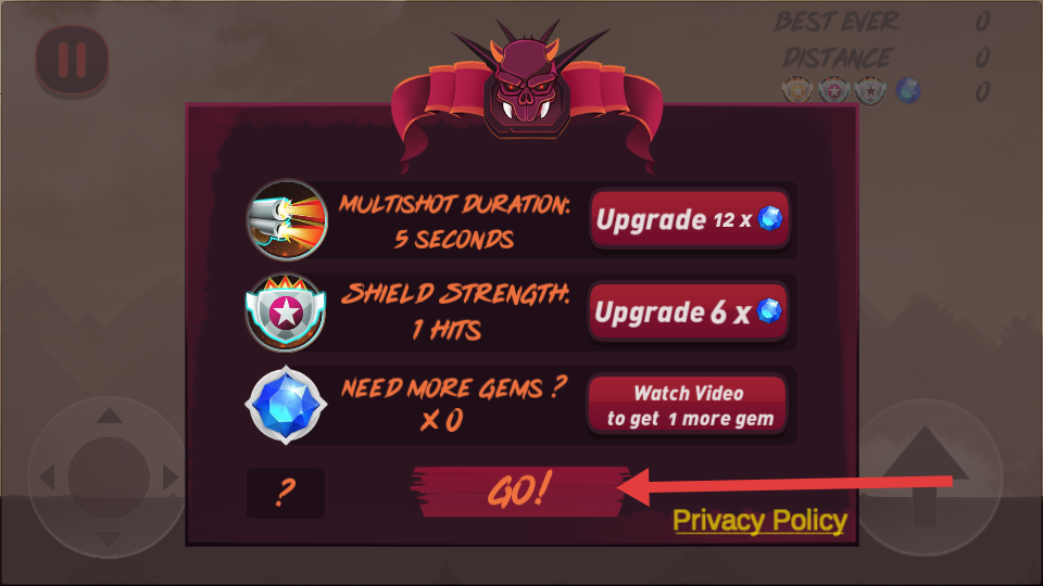 2、可升級多重射擊持續時間、護盾強度等屬性,消耗寶石升級后,點擊GO進入游戲,能獲得更強戰力,更順利推進游戲。