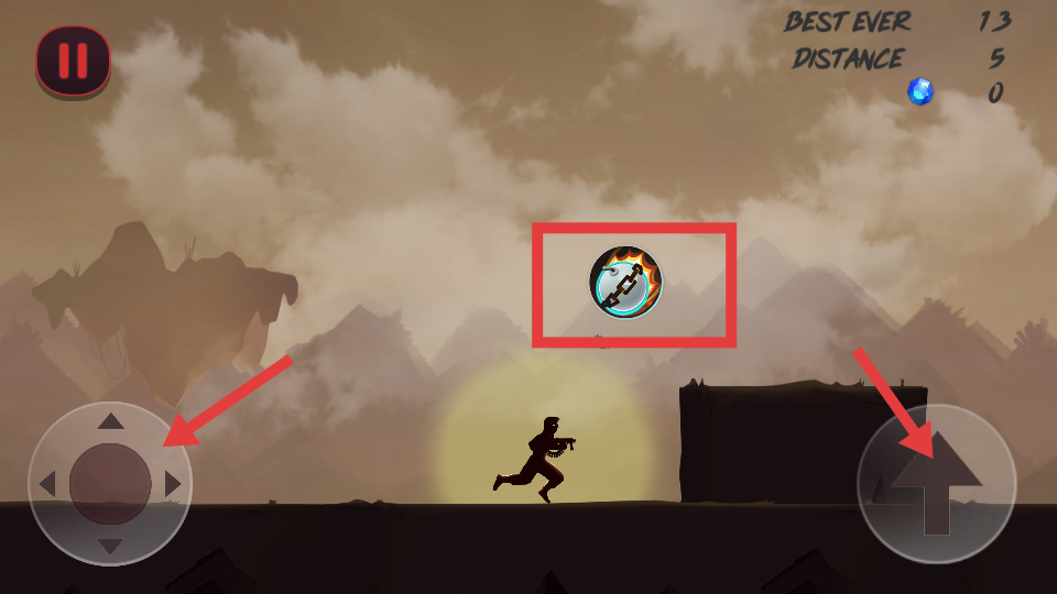 3、用左側搖桿控制移動方向,右側向上箭頭按鈕控制跳躍,遇到道具時靠近并獲取,道具可助力戰斗或移動提升游戲體驗。