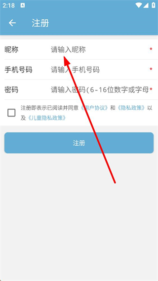 4、進入注冊頁面,需填寫昵稱、手機號碼,設置密碼,勾選相關協議后,點擊注冊按鈕完成賬號注冊。