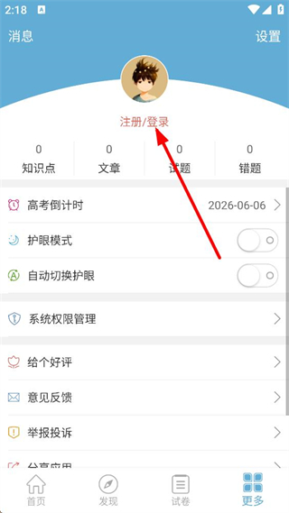 2、進入更多頁面,顯示注冊、登錄入口,還有高考倒計時、護眼模式等功能選項,點擊注冊、登錄進入登錄頁面。