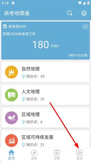 1、進入高考地理通首頁,可見高考倒計時模塊,及自然地理、人文地理等知識板塊,底部設更多按鈕,點擊該按鈕進入更多頁面。