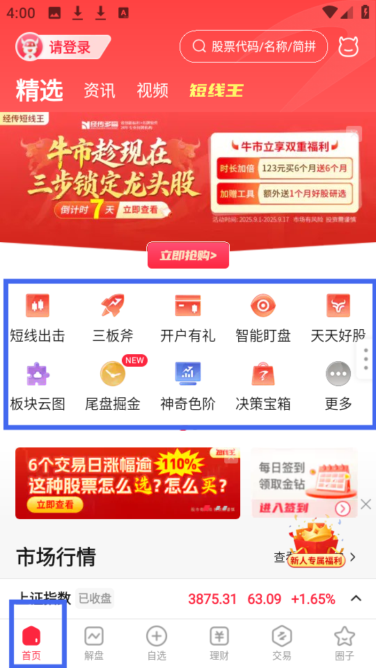 1、首頁頂部有登錄與搜索框精選頁面主推短線王,含短線出擊等功能,還有牛市活動下方展示上證指數收盤情況。