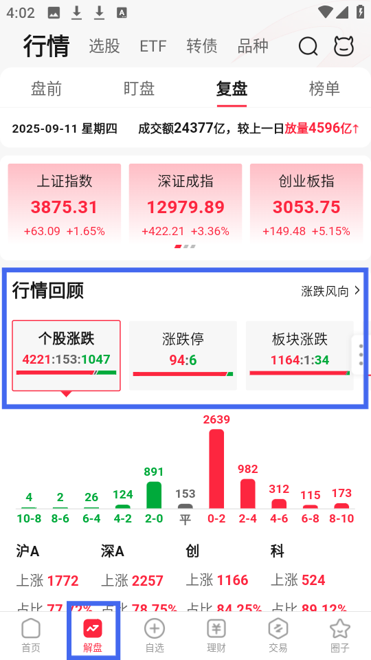 2、解盤界面聚焦行情呈現三大指數數據,詳細列出個股、漲跌停及板塊漲跌情況,便于投資者復盤市場表現。