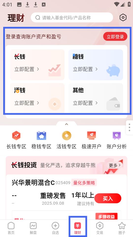 3、理財頁面提示登錄查資產盈虧,分長錢、穩錢等專區展示基金產品,如興華景明混合C提供資產配置便捷入口。