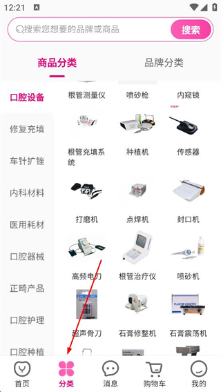 3、進入分類頁面,查看商品分類列表,選擇對應的牙科用品分類,瀏覽該分類下的商品內容。