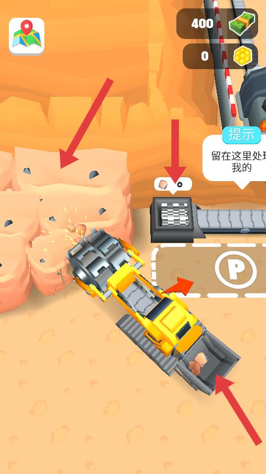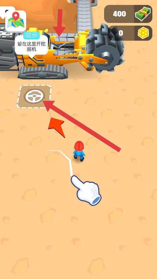 1、游戲界面手勢提示,操控角色前往挖掘機的方向盤處,準備操作挖掘機進行挖掘工作,開啟資源獲取流程。