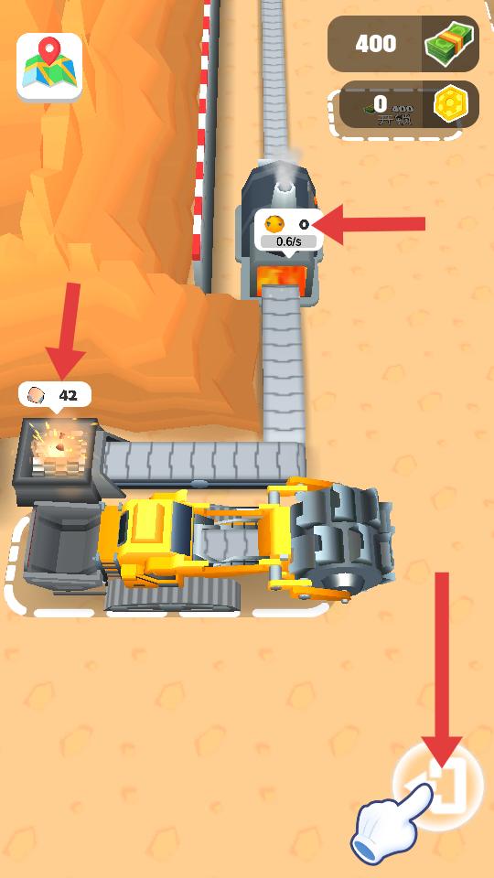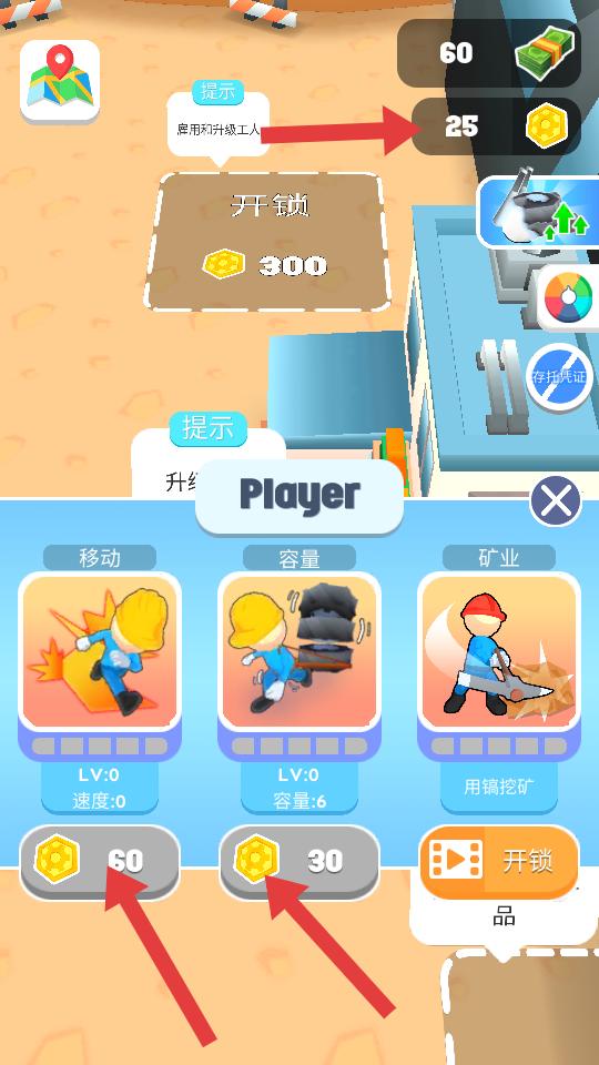 4、使用獲得的資源和對應的道具,升級角色的移動、容量、礦業等能力,提升整體效率。