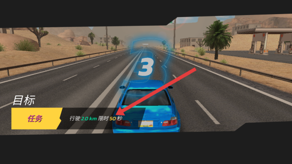 1、進入游戲,會看到任務提示,需50秒內駕駛車輛行駛2km,準備好后開始公路上疾馳,開啟挑戰。